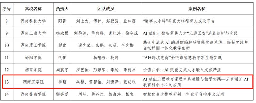 近日,湖南省教育厅下发了《湖南省教育厅关于公布2025年湖南省“人工智能+高等教育”典型应用场景案例的通知》,我校教务处处长李理教授团队撰写的“AI赋能工程教育课程体系建设与教学实践——云享湖工AI教育科创中心的应用”被认定为湖南省“人工智能+高等教育典型应用场景案例”,今年湖南省共认定14个典型案例。这个案例是我校被湖南省认定的首个典型案例,同时被湖南省推荐参评教育部典型案例。